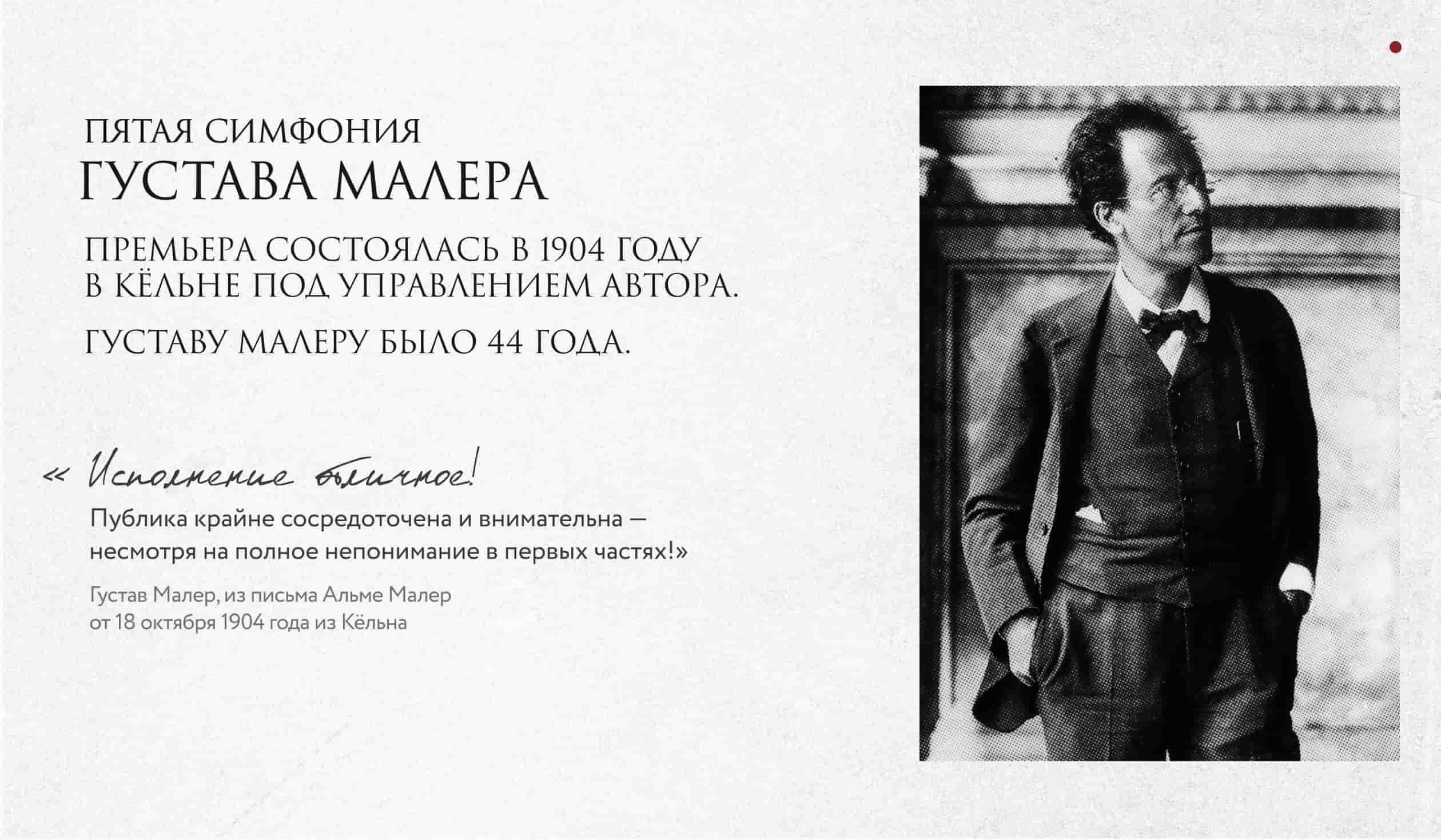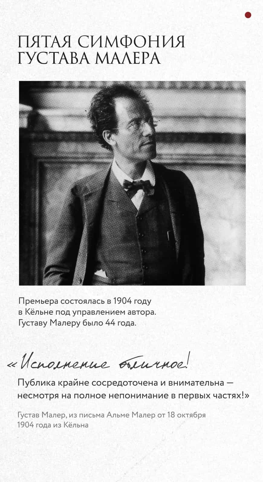 Когда Малер сочинял свою Пятую, он во многом отступил от своих прежних правил: исключил тексты и вокальные партии и написал чисто инструментальное сочинение, а значит, вернулся к традиционному пониманию симфонии.
